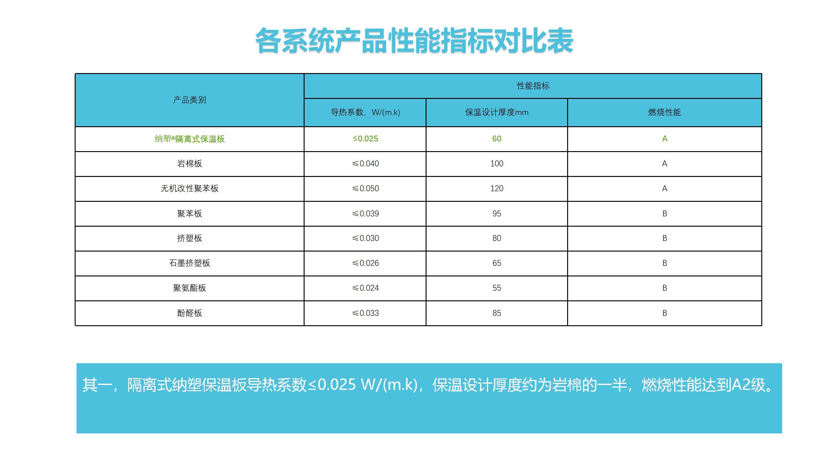 纳塑®隔离式保温板导热系数为0.025,满足75%节能要求下保温板厚度仅需5-7cm。保温板厚度小,可有效的减少公摊面积,提高用户的净使用面积。