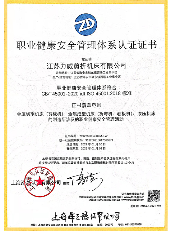 职业健康安全管理体系认证证书